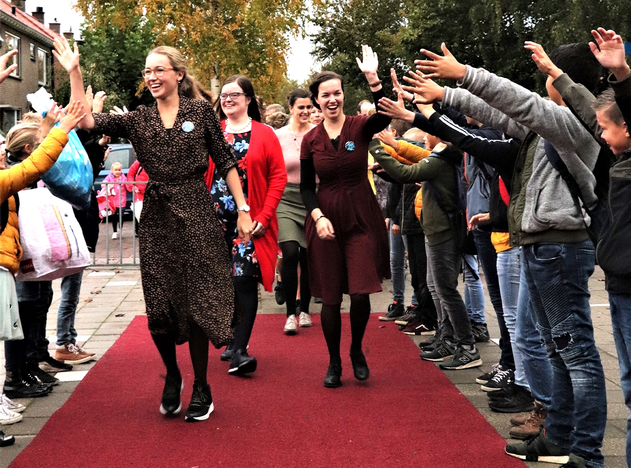 Onder luid applaus van kinderen en hun ouders liepen de docenten iets na achten over de rode loper de school binnen, waar ze uit handen van Annelies Kraaiveld, de manager van de pabo bij Driestar hogeschool, een taart overhandigd kregen met de bijbehorende felicitaties.