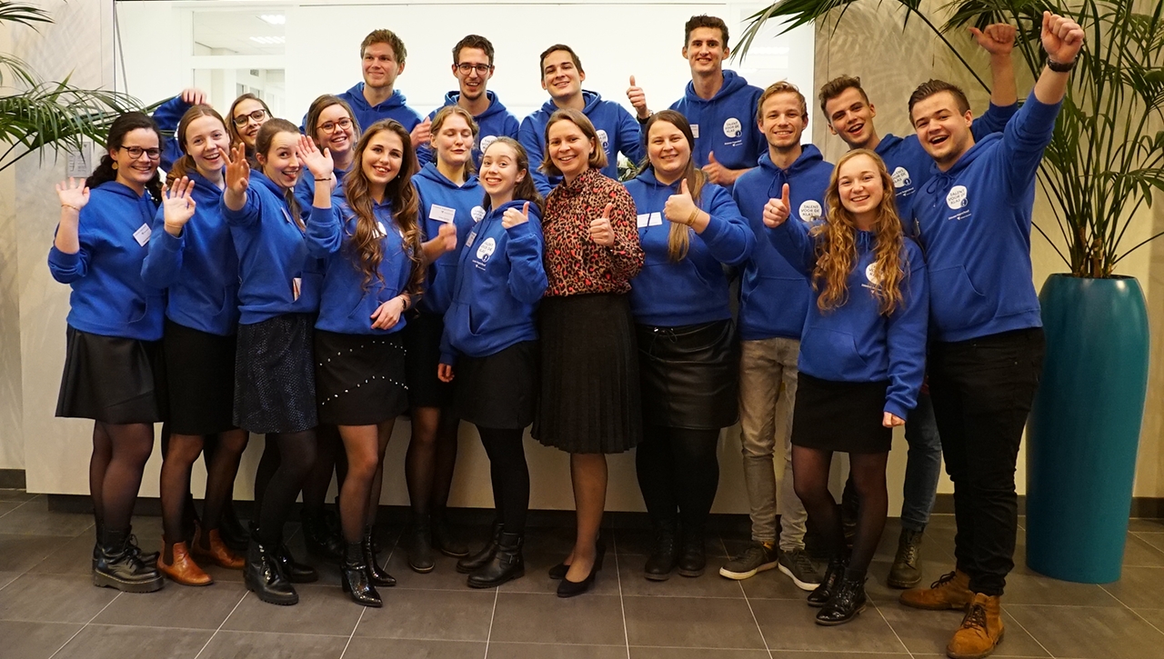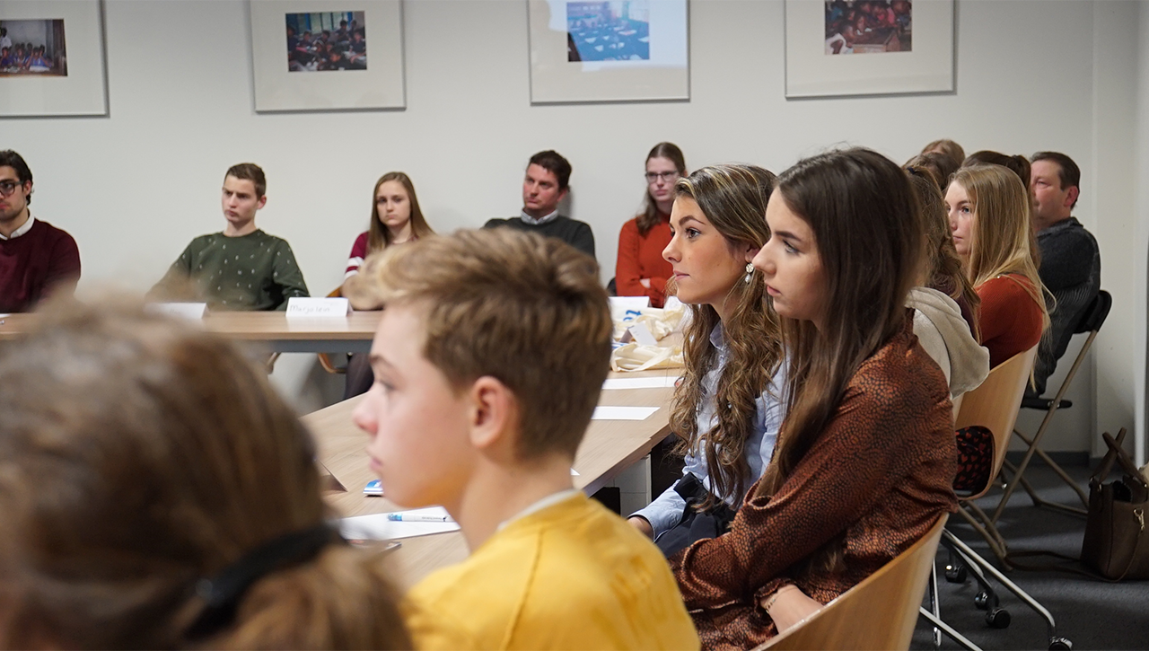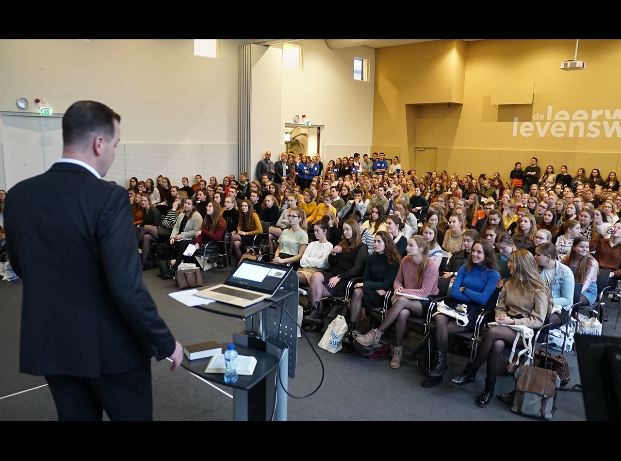 De regenachtige morgen weerhield onze gasten gelukkig niet om af te reizen naar Gouda voor onze open collegedag. Al voor tien uur stroomde de congreszaal vol. Bijna te vol zelfs. Jongens en meiden die wat later kwamen konden nog een plekje vinden in de gangpaden of tegen de wanden achterin en aan de zijkant van de zaal.
