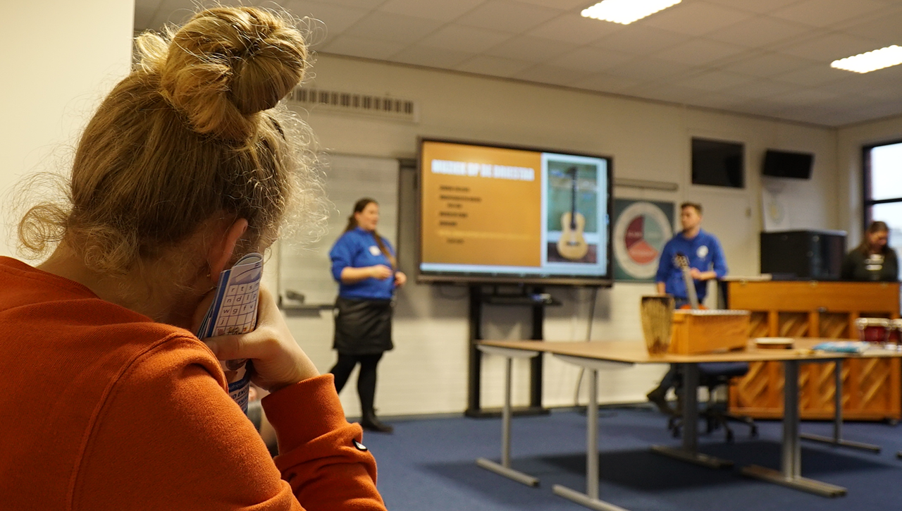 De geïnteresseerden in een lerarenopleiding voortgezet onderwijs (lvo) krijgen een beroepsgerichte voorlichting van de heer Johan Strijbis.
