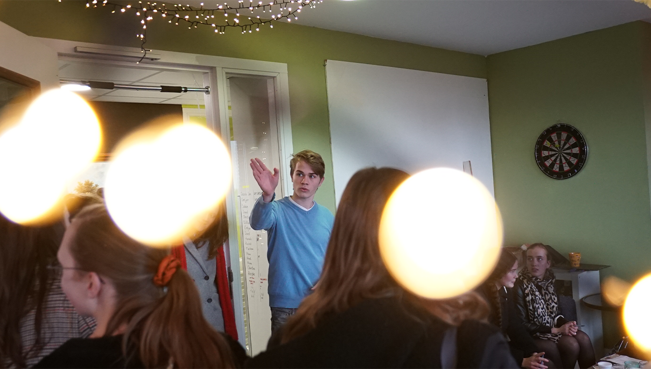 De heer Arjan van Tol (opleidingsmanager van de pabo) opent met een korte Bijbelstudie. We lezen Spreuken 30: 18-28, de les van de kleine dieren en zingen uit Psalm 19. De heer van Tol vertelt ons over het vermogen van mieren om vooruit te kijken, hoe konijnen bescherming weten te vinden, hoe sprinkhanen eensgezind zijn en spinnen volhardend. Daar kunnen we als aankomende studenten wel wat van leren.