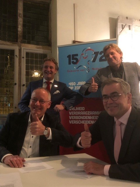 Achter de ondertekenaars van het contract, Ton van der Schans en Jos Wienen, burgemeester van Haarlem, staan twee bestuursleden van SW1572: